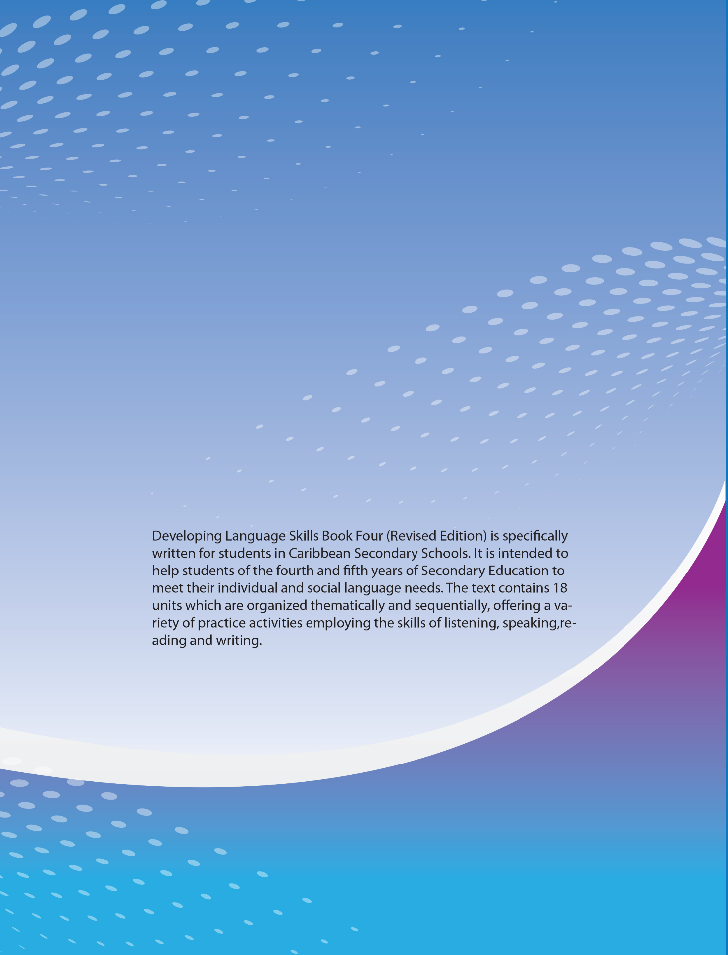 Developing Language Skills is specifically written for students in Caribbean secondary schools. It is intended to help secondary education students meet their individual and social language needs. These texts contain units which are organized thematically and sequentially, offering a variety of practice activities employing the skills of listening, speaking, reading and writing.