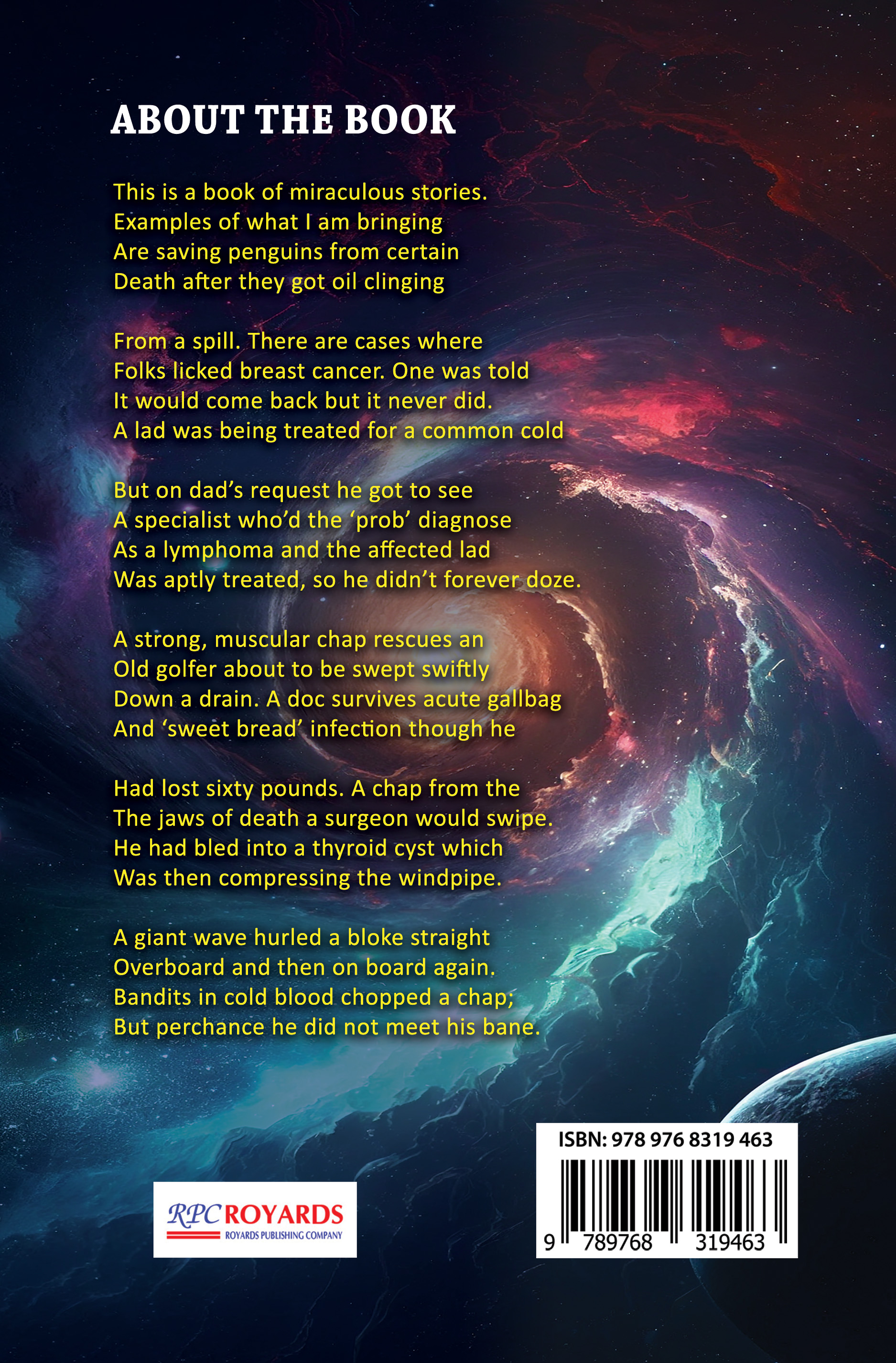 This is a book of miraculous stories. Examples of what I am bringing Are saving penguins from certain Death after they got oil clinging From a spill. There are cases where Folks licked breast cancer. One was told It would come back but it never did. A lad was being treated for a common cold But on dad’s request he got to see A specialist who’d the ‘prob’ diagnose As a lymphoma and the affected lad Was aptly treated, so he didn’t forever doze. A strong, muscular chap rescues an Old golfer about to be swept swiftly Down a drain. A doc survives acute gallbag And ‘sweet bread’ infection though he Had lost sixty pounds. A chap from the The jaws of death a surgeon would swipe. He had bled into a thyroid cyst which Was then compressing the windpipe. A giant wave hurled a bloke straight Overboard and then on board again. Bandits in cold blood chopped a chap; But perchance he did not meet his bane.