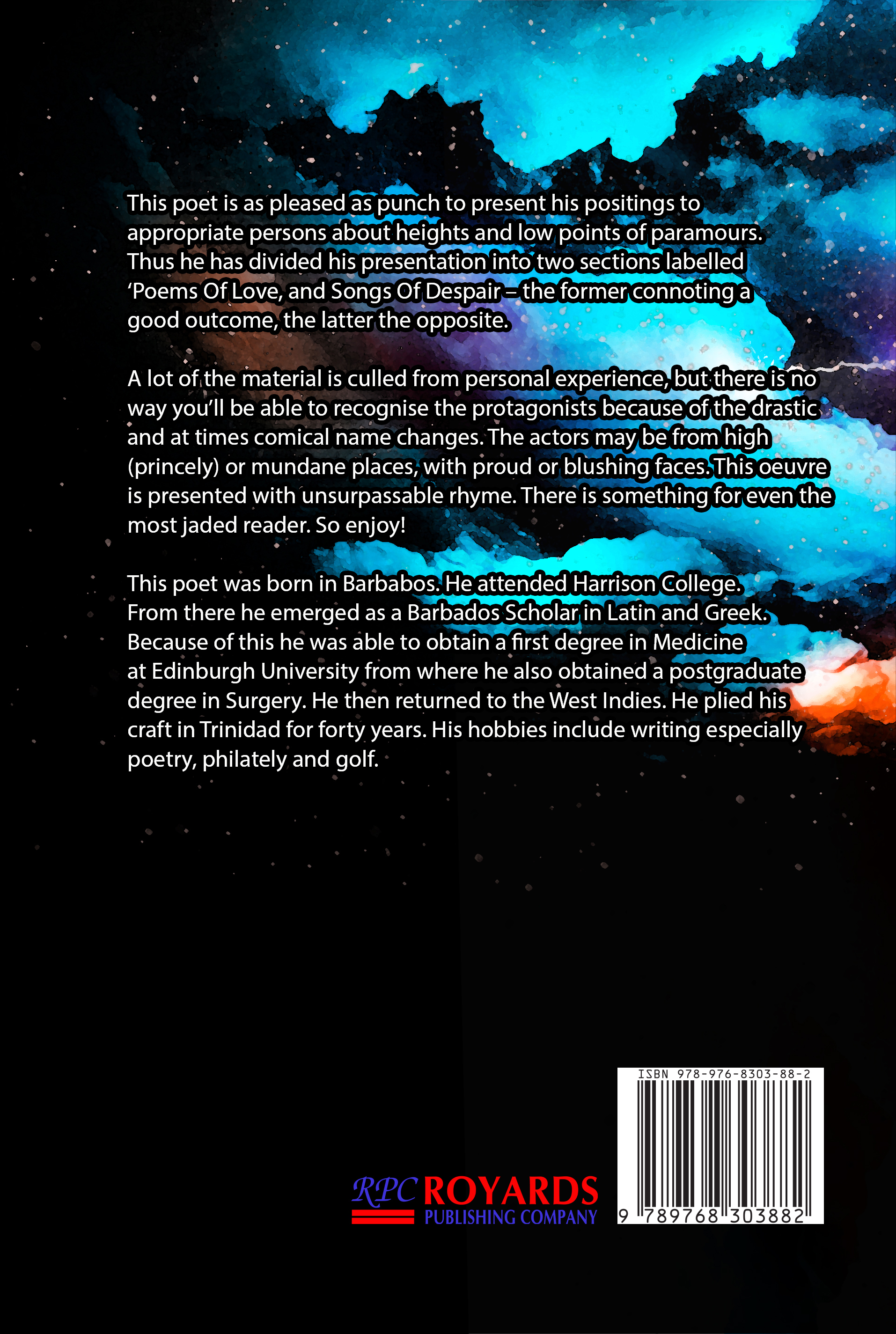 This poet is as pleased as punch to present his positings to appropriate persons about heights and low points of paramours. Thus he has divided his presentation into two sections labelled ‘Poems Of Love, and Songs Of Despair – the former connoting a good outcome, the latter the opposite. A lot of the material is culled from personal experience, but there is no way you’ll be able to recognise the protagonists because of the drastic and at times comical name changes. The actors may be from high (princely) or mundane places, with proud or blushing faces. This oeuvre is presented with unsurpassable rhyme. There is something for even the most jaded reader. So enjoy! This poet was born in Barbabos. He attended Harrison College. From there he emerged as a Barbados Scholar in Latin and Greek. Because of this he was able to obtain a first degree in Medicine at Edinburgh University from where he also obtained a postgraduate degree in Surgery. He then returned to the West Indies. He plied his craft in Trinidad for forty years. His hobbies include writing especially poetry, philately and golf.